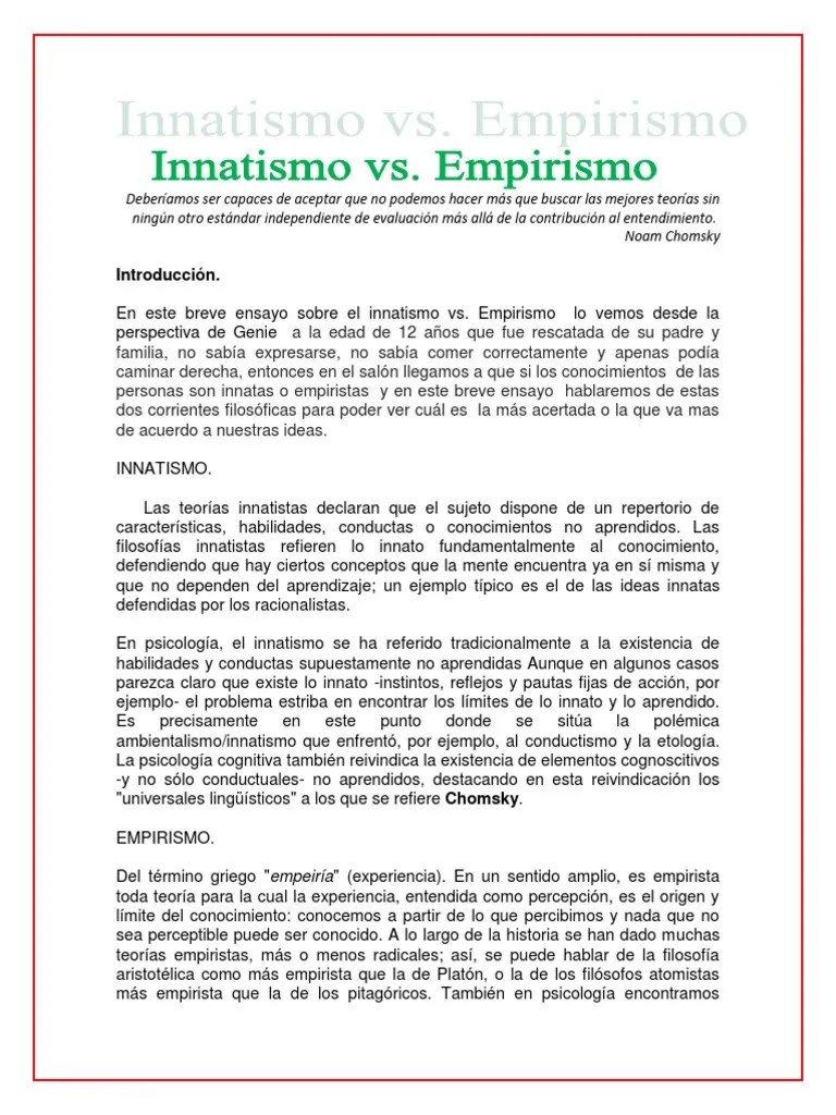 Sus ideas resumen los dos polos opuestos de este debate. Suspensión de cualquier tipo de afirmación de verdad de una idea hasta no estas seguro de que es cierta. Posted on 17 febrero 2020 por apuntes. Un ejemplo de aprendizaje innato es cuando un bebe subciona el pezón de su madre.